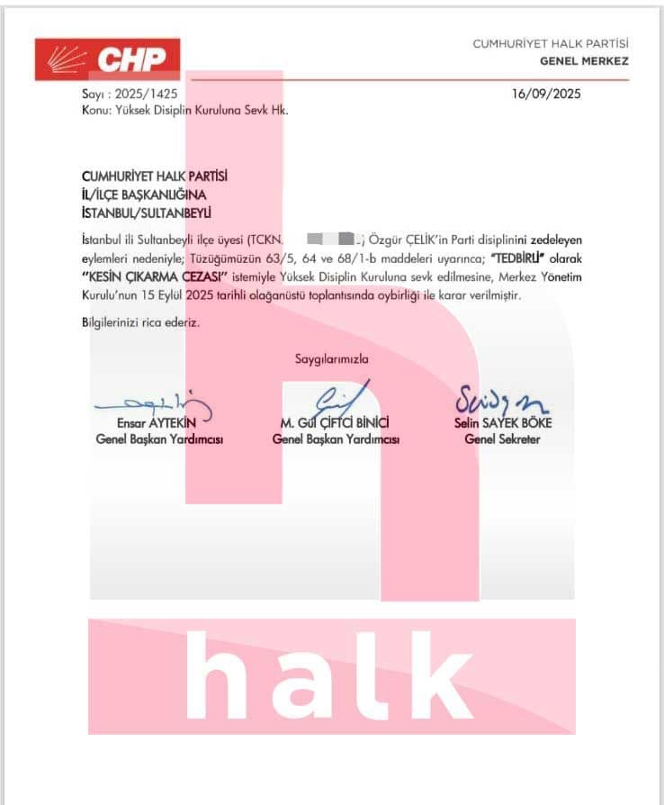 Cumhuriyet Halk Partisi’nde (CHP) İstanbul Sultanbeyli üyesi Özgür Çelik hakkında “tedbirli ihraç” süreci başlatıldı. Çelik, parti disiplinini zedeleyen eylemleri nedeniyle kesin çıkarma talebiyle Yüksek Disiplin Kurulu’na sevk edildi.