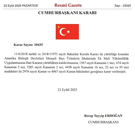 22 Eylül 2025 tarihli Resmi Gazete'de yayımlanan ve Cumhurbaşkanı Recep Tayyip Erdoğan'ın imzasını taşıyan karara göre; 2018 yılında bazı ABD ürünlerine uygulanan 'ek mali yükümlülükler' kaldırıldı.