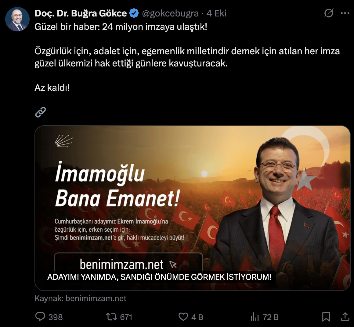 "Güzel bir haber: 24 milyon imzaya ulaştık! Özgürlük için, adalet için, egemenlik milletindir demek için atılan her imza güzel ülkemizi hak ettiği günlere kavuşturacak. Az kaldı!"