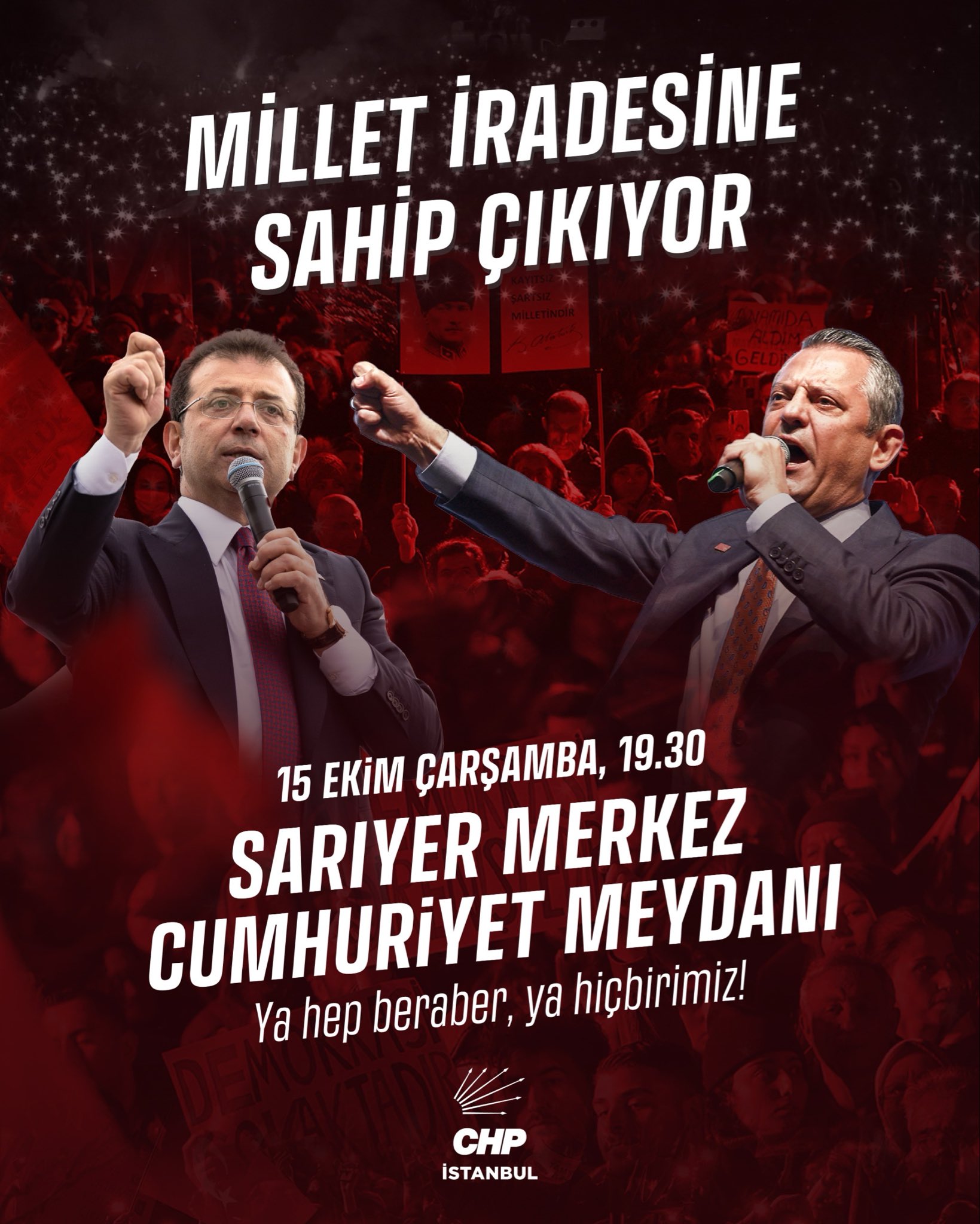 CHP İstanbul İl Başkanı Özgür Çelik, partisinin bu haftaki "Millet İradesine Sahip Çıkıyor" mitingi için vatandaşlara çağrıda bulundu. Mitingin Sarıyer'de yapılacağını belirten Çelik, "Adaletsizliğe karşı susmuyoruz, halkımızın iradesini savunuyoruz!" ifadelerini kullandı.