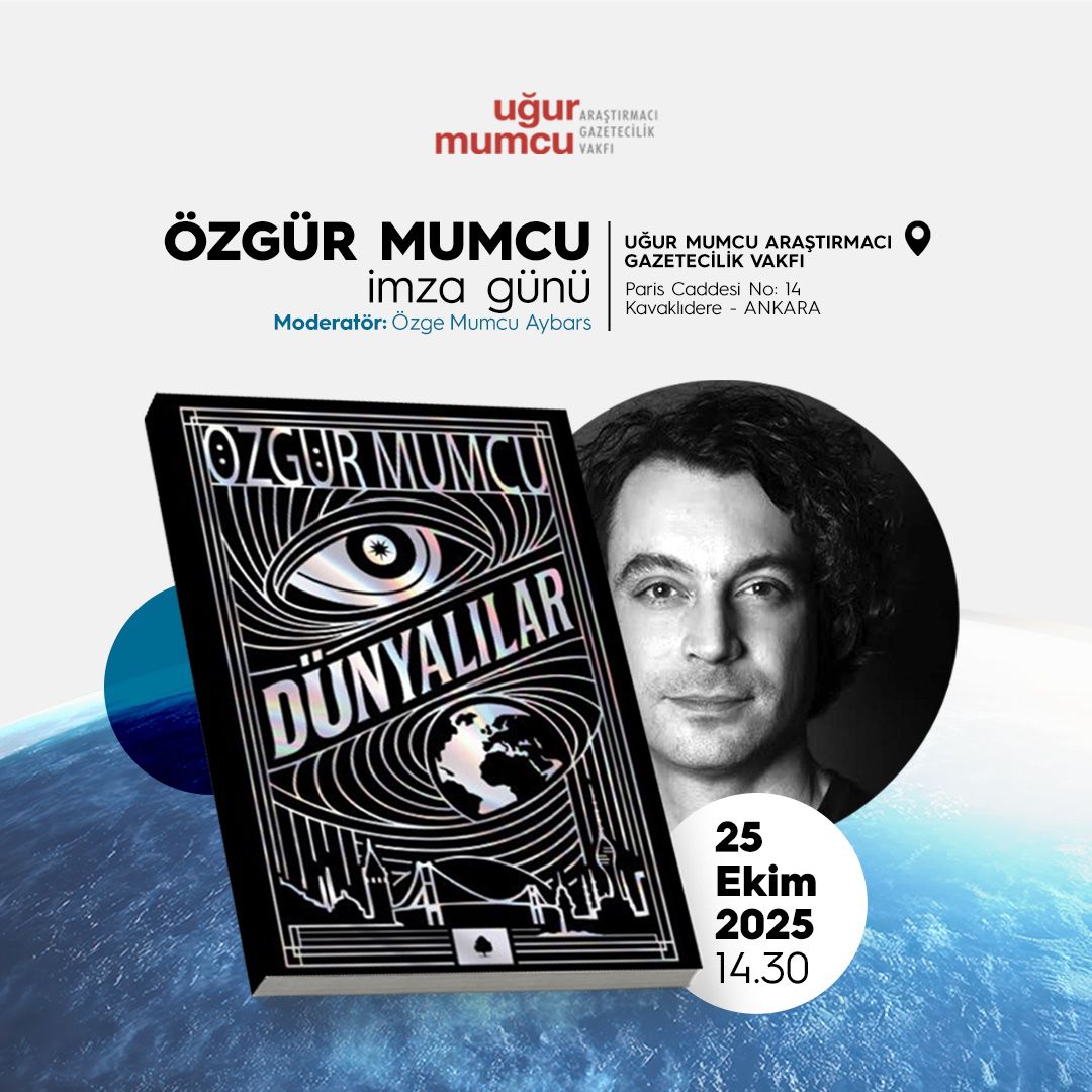 Yazar Özgür Mumcu, yeni romanı “Dünyalılar” ile okurlarıyla buluşuyor. Uğur Mumcu Araştırmacı Gazetecilik Vakfı tarafından düzenlenen imza günü etkinliği, 25 Ekim 2025, Cumartesi günü Ankara’da gerçekleştirilecek.