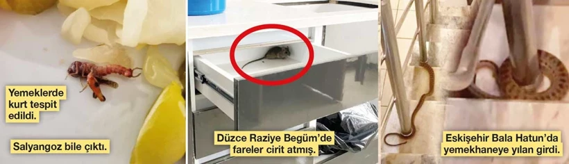 Düzce Raziye Begüm yemekhanesinde fare, Eskişehir Bala Hatun yemekhanesinde yılan bulundu; Kütahya Hezar Dinari’de ekmeklerin arasında fare görüldü.