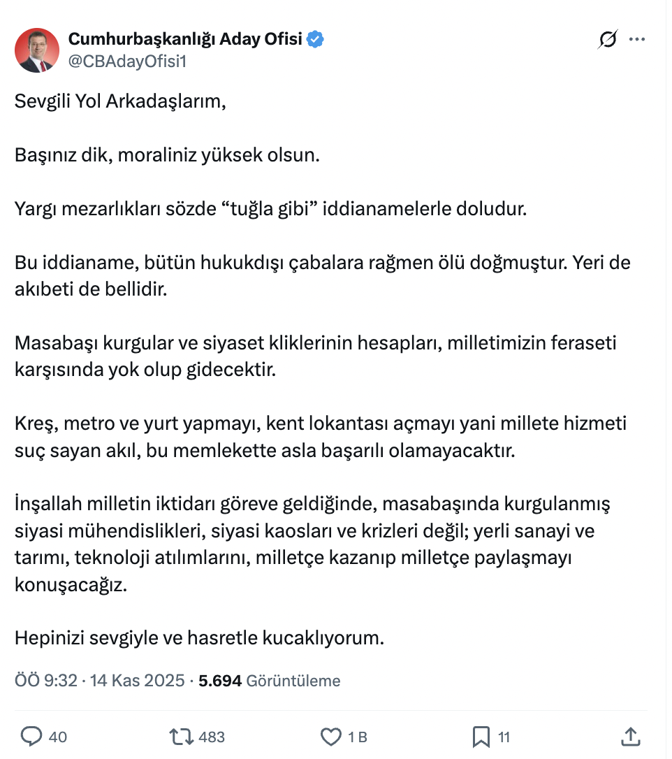 İmamoğlu'na ait Cumhurbaşkanlığı Aday Ofisi X hesabı "millî güvenlik ve kamu düzeninin korunması" gerekçesiyle erişime engellenmiş ve karar internet servis sağlayıcılarına iletilmişti. Yeni açılan hesaptan mesajlarını aktarmayı sürdüren İmamoğlu, İBB iddianamesi için “Yargı mezarlıkları sözde tuğla gibi iddianamelerle doludur. Bu iddianame bütün hukuk dışı çabalara rağmen ölü doğmuştur. Yeri de akıbeti de bellidir” dedi.