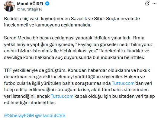 Söz konusu iddia ile ilgili TFF yetkilileriyle konuştuğunu aktaran gazeteci Murat Ağırel, Tuttur.com'dan TFF'nin veri almadığı bilgisini aldığını aktardı.