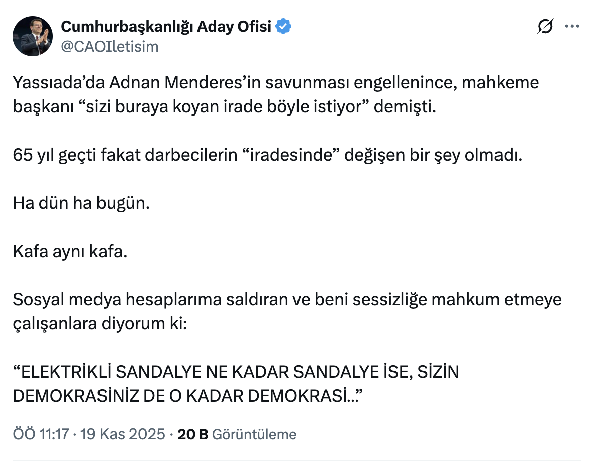 Tutuklu İBB Başkanı Ekrem İmamoğlu, sosyal medya hesaplarına yönelik saldırılar nedeniyle sessiz bırakılmaya çalışıldıkları ifade etti. Bir hafta içinde üç kere erişim engeli getirilen X hesaplarının ardından açılan yeni Cumhurbaşkanlığı Aday Ofisi hesabı üzerinden mesajını paylaşan İmamoğlu, "Elektrikli sandalye ne kadar sandalye ise, sizin demokrasiniz de o kadar demokrasi…’ dedi.